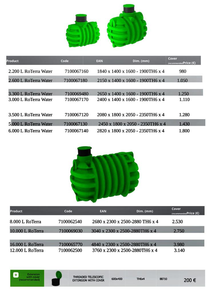 Az esővíz-gyűjtők polietilénből készülnek, és a talajba történő betemetésre szolgálnak. Alapfelszerelés: teleszkópos fedlap kiemelés 600 x 600 mm, négy csavarral rögzített vízszintes polietilén fedlap, járhatóság 200 kg-ig, tömítés a fedlapkiemelő és a fedél között, két sík felület a tartály végein a csatlakozási lehetőséget biztosítják .