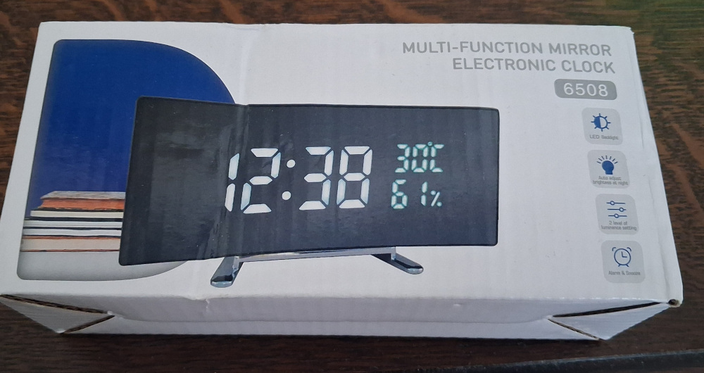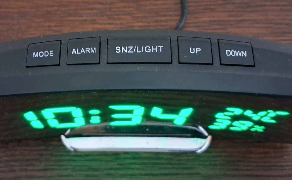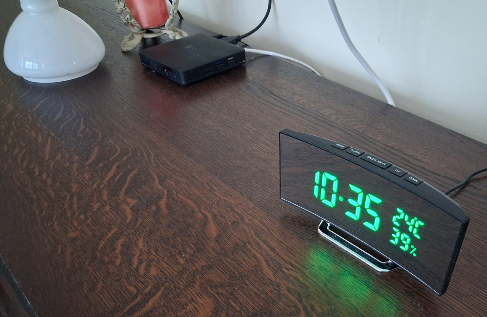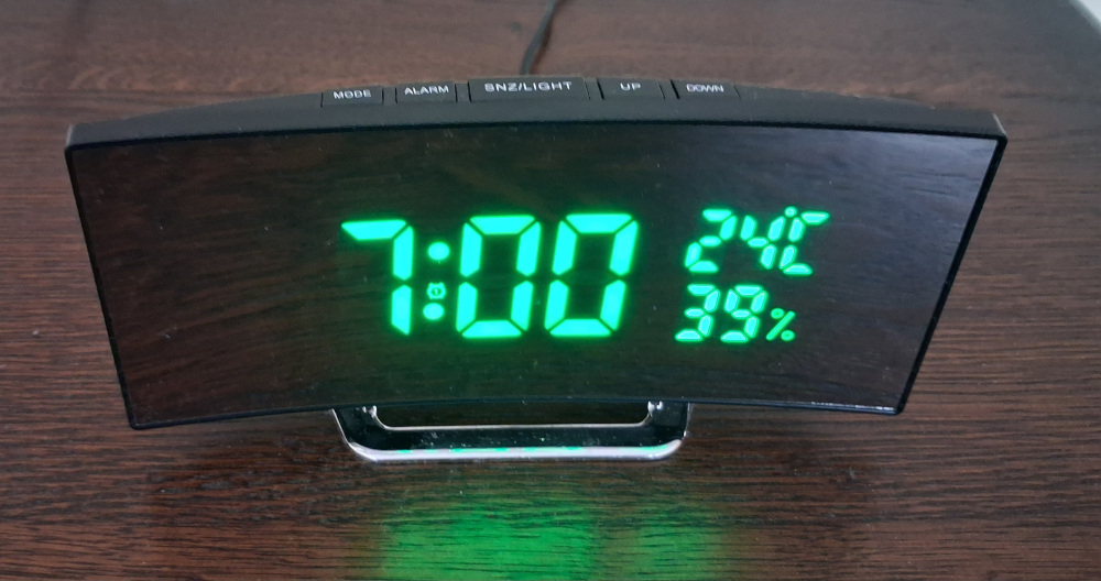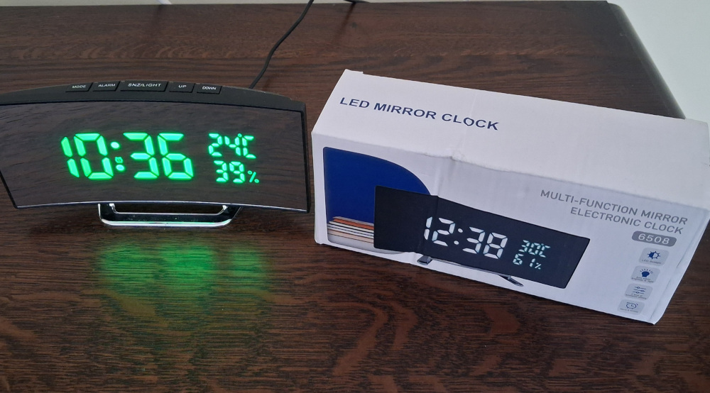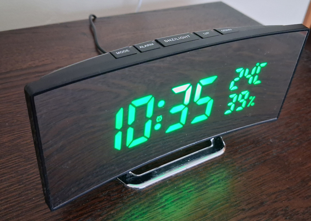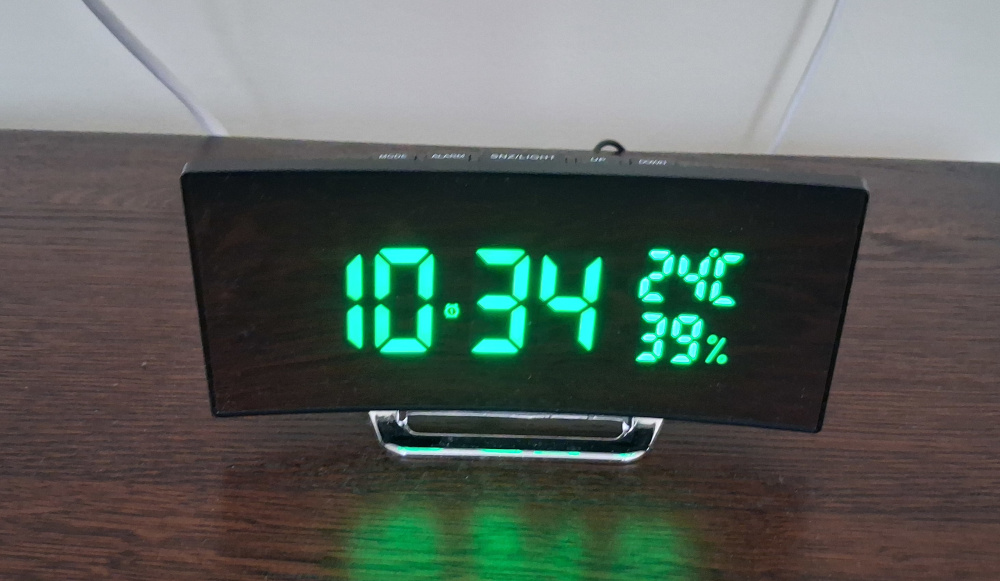 Ébresztő óra , zöld LED kijelzővel , hőfok és páratartalom mérővel . USB kábellel. Elemek nélkül.