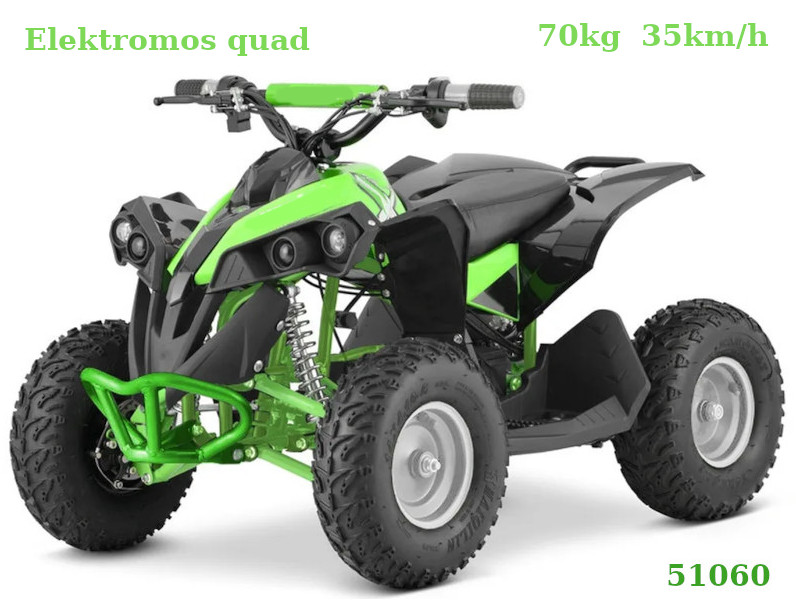 Az akkus quadok gyorsaság és az akkumulátor működése függ a tereptől és a sofőr súlyától. , amely 70 kg maximum. Lánc nélküli direkt hajtás, differenciálmű, hátramenet, kürt, töltöttségi szint mutató.